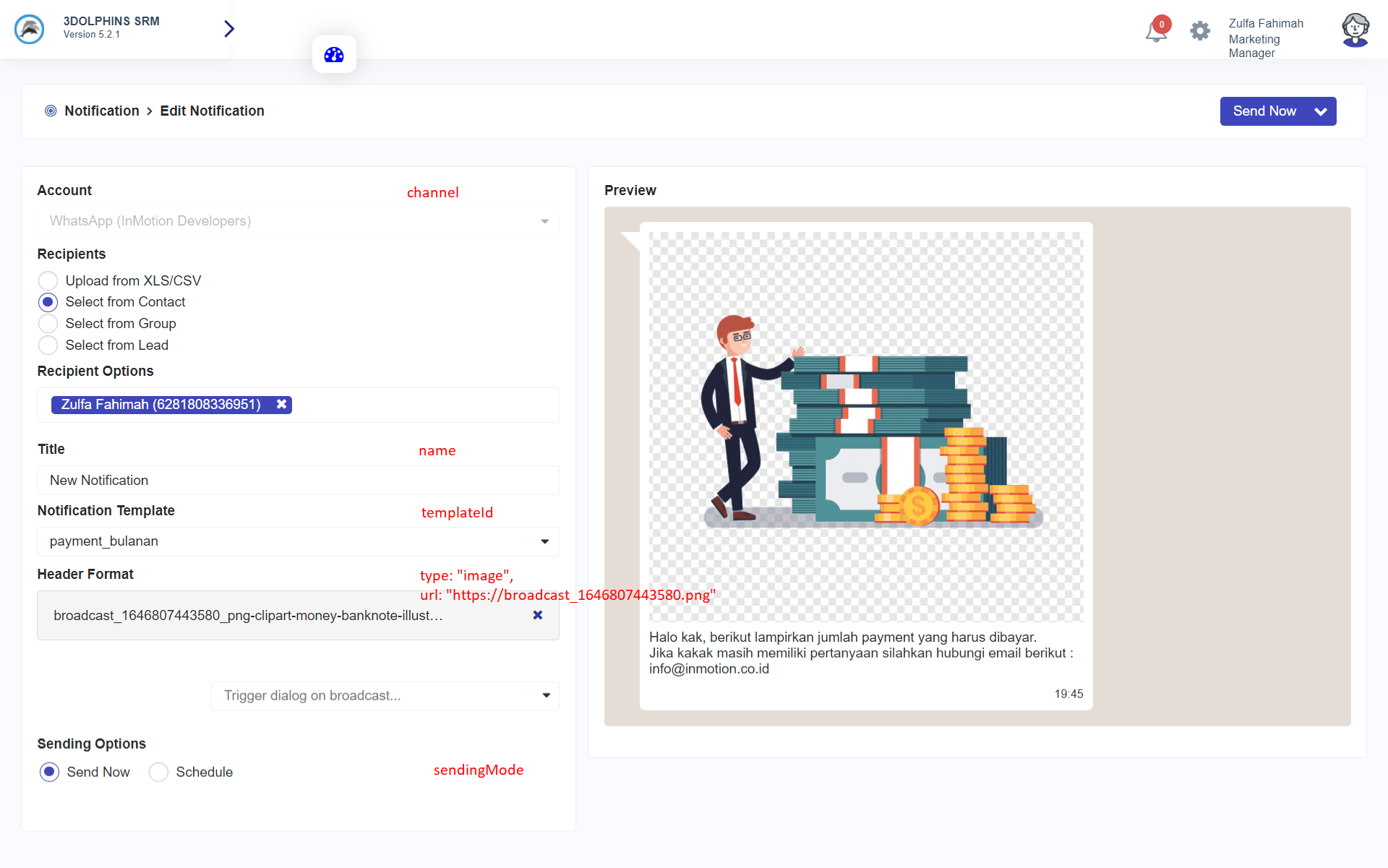 Ketika Anda memasukkan field **channel** menggunakan channel id pada API akan seperti memilih **account** pada aplikasi, begitupun dengan field **templateId** untuk memilih **notification** **template** Anda. Field **name** juga akan menjadi **title** untuk notifikasi Anda. Field **sendingMode** untuk menentukan **sending option** yang akan digunakan (apabila menggunakan 'schedule' maka, Anda dapat memilih waktu jadwal pengiriman notifikasi tersebut).&#x20;