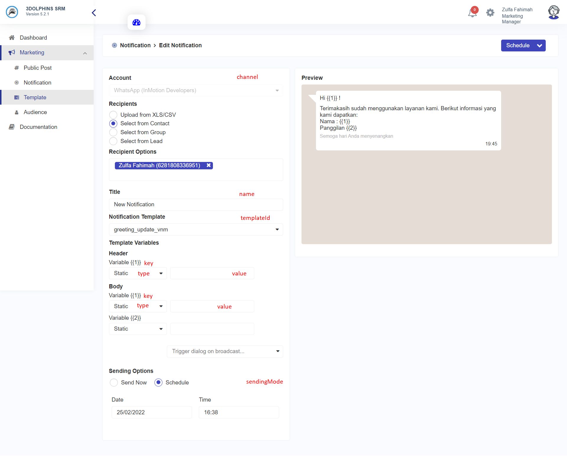 Ketika Anda memasukkan field **channel** menggunakan channel id pada API akan seperti memilih **account** pada aplikasi, begitupun dengan field **templateId** untuk memilih **notification** **template** Anda. Field **name** juga akan menjadi **title** untuk notifikasi Anda. Ketika Anda menggunakan broadcast macro, field template variables untuk header dan body akan muncul untuk mengisi nilai field **key,type** dan **value**. Field **sendingMode** untuk menentukan **sending option** yang akan digunakan (apabila menggunakan 'schedule' maka, Anda dapat memilih waktu jadwal pengiriman notifikasi tersebut).&#x20;