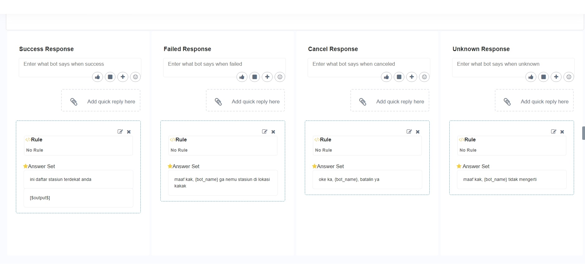 | Cancel Response  | <p>Response dialog oleh bot saat pelanggan mengirimkan respons pembatalan. <br></p><p><strong>Contoh:</strong> </p><p>oke kak, {bot\_name} batalin ya.</p>                                                                                                                                                                                                             |
