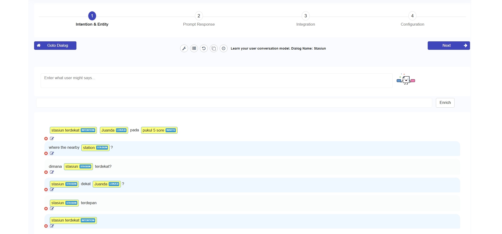Misalnya, Anda ingin menambahkan dialog tentang 'Stasiun'. Anda bisa menambahkan beberapa pertanyaan seperti 'stasiun terdekat', dan 'stasiun dekat Juanda', tambahkan banyak pertanyaan yang mungkin untuk situasi ini. Stasiun, stasiun terdekat adalah Intention, dan Juanda adalah Entity dengan nama location.