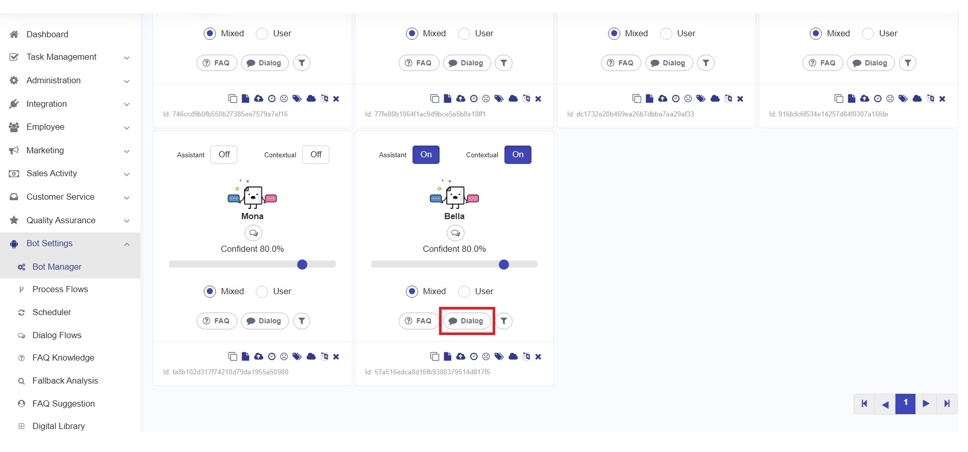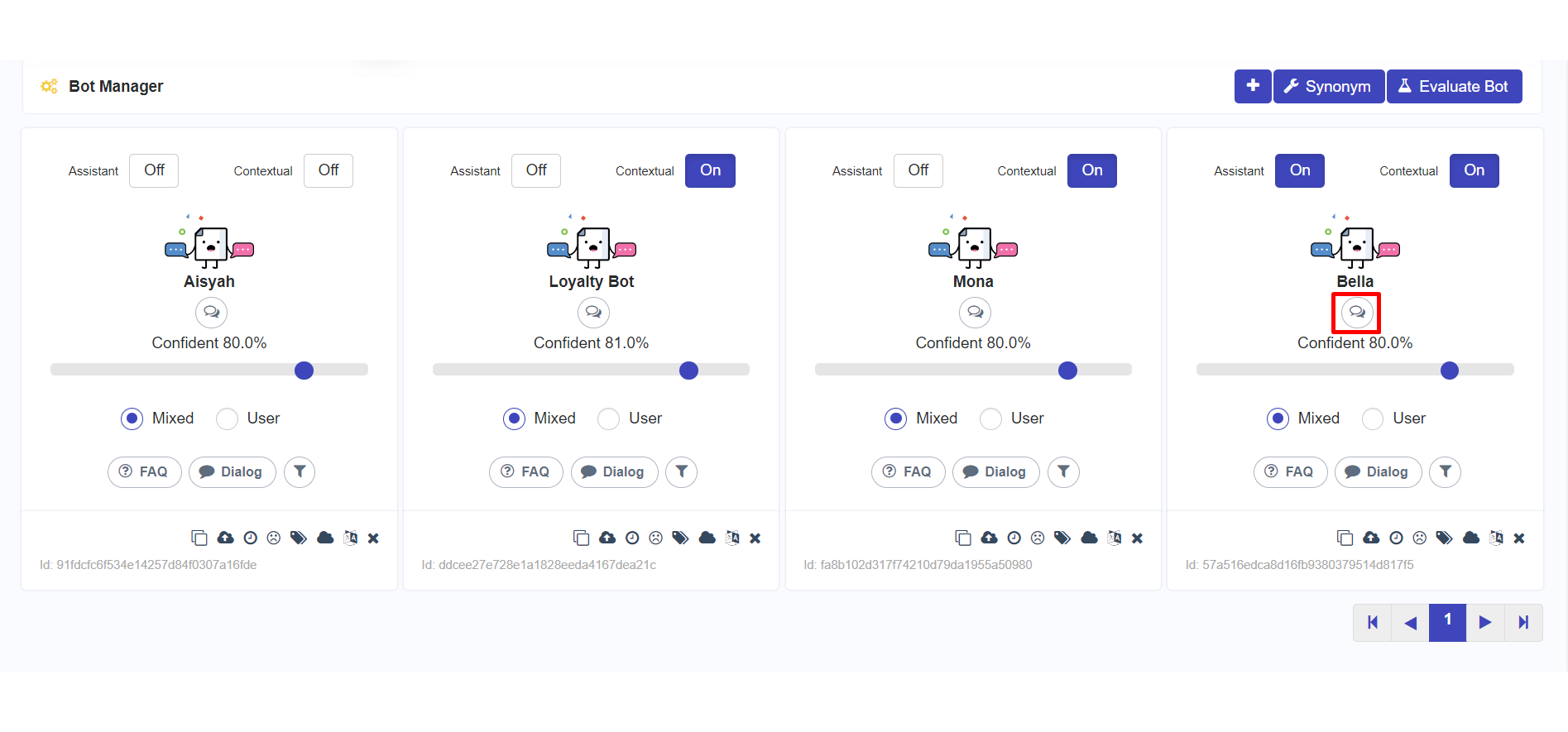 Sebelum mengetes Dialog ke dalam Bot emulator, pastikan bahwa Anda sudah melakukan Attach Dialog ke dalam Bot. Masuk ke menu **Bot Settings** dan klik submenu **Bot Manager** lalu, Anda akan melihat halaman bot manager, pilih bot, dan klik tombol '**Dialog**' seperti gambar berikut.