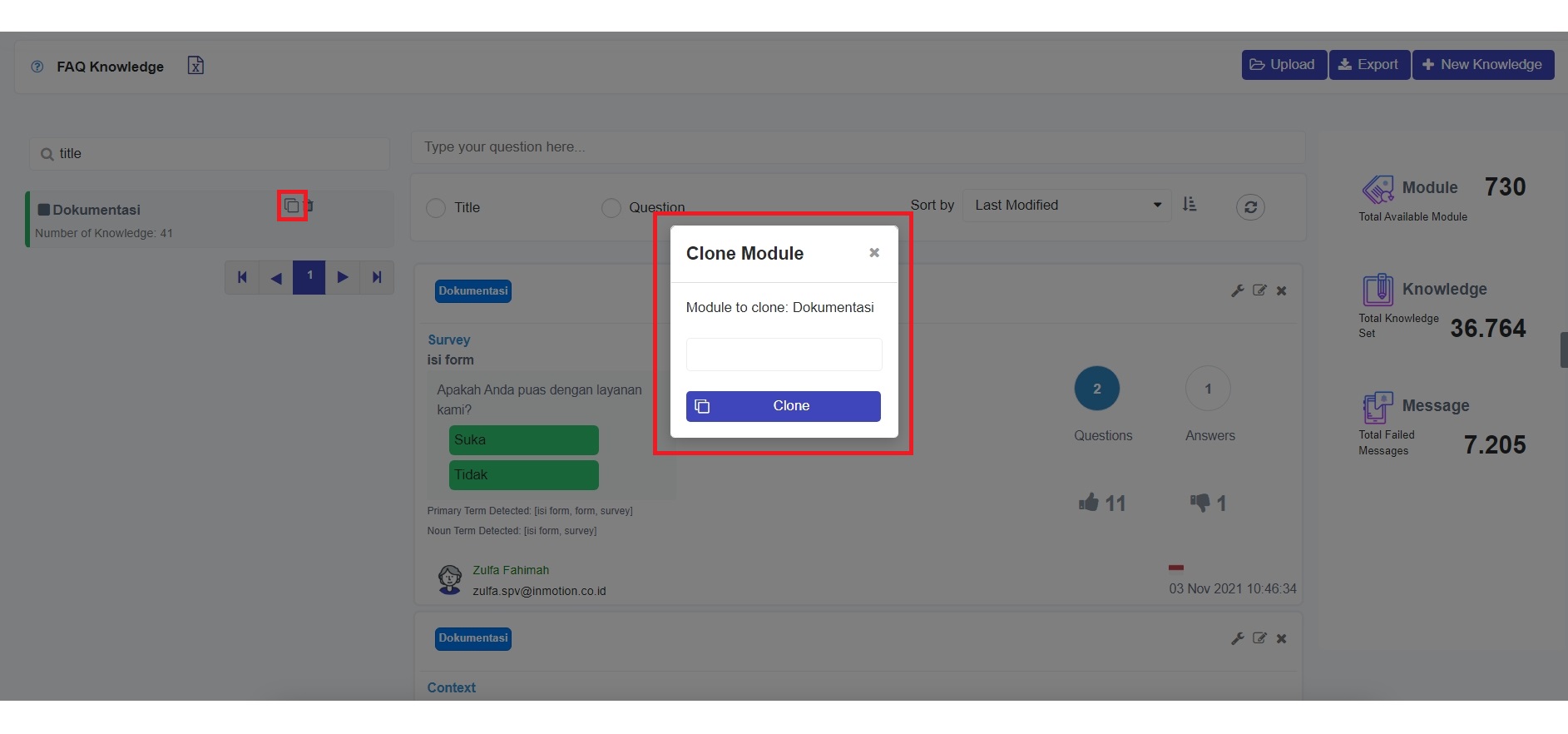 Fitur ini akan menduplikasi Module yang sudah pernah dibuat sebelumnya. Sebagai contoh, jika sebelumnya Anda telah membuat Module "Dokumentasi" dan Anda ada kebutuhan baru untuk membuat modul knowledge dari Bot yang berbeda, maka kamu bisa coba menduplikat Module tersebut dengan memilih tombol **'Clone'** ( <img src="https://3286717921-files.gitbook.io/~/files/v0/b/gitbook-legacy-files/o/assets%2F-MNQidQwa-0K9_KnQpoc%2F-MXkH81owZ1WLUZzuqAC%2F-MXkI0CAs5vkz-tuEkWq%2Ficon%202.png?alt=media&#x26;token=2ebd4889-276a-4c27-a848-9e8a0da10c7b" alt="" data-size="line"> ) pada bagian sebelah kanan nama Module.&#x20;