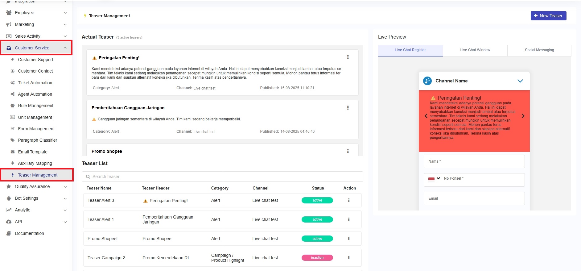 Kami mempermudah pembaruan konten live chat dan pesan media sosial Anda melalui fitur Teaser Management. Dengan fitur ini, Anda dapat langsung memperbarui informasi secara praktis melalui dashboard. Untuk memulai, masuk ke halaman Customer Service dan pilih menu Teaser Management seperti gambar berikut.