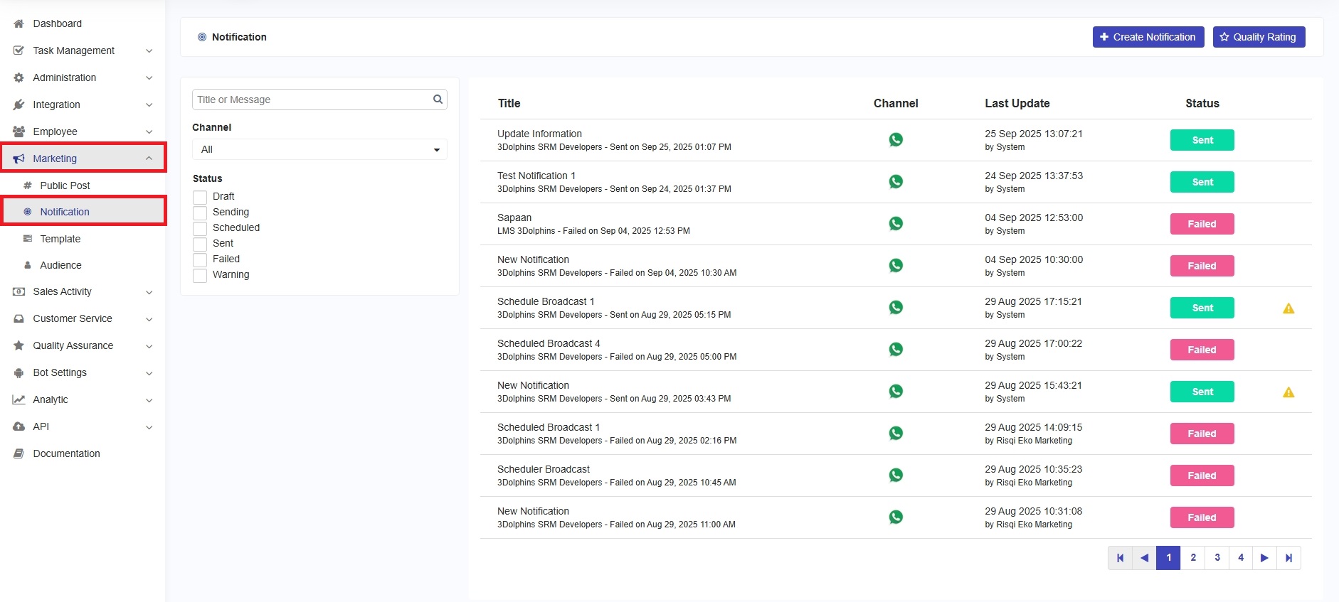 | Status         | <p>Status dari Notification. Terdapat 5 (lima) status notification, yaitu:</p><ol><li><strong>Draft:</strong> Rancangan notification yang masih disimpan (belum siap untuk dikirimkan). </li><li><strong>Sending:</strong> Notification yang sudah dikirimkan namun belum diterima oleh pelanggan. </li><li><strong>Scheduled:</strong> Notification yang sudah dibuat namun dijadwalkan untuk dikirim pada waktu tertentu.</li><li><strong>Sent:</strong> Notification yang sukses terkirim ke pelanggan.</li><li><strong>Failed:</strong> Notification yang gagal dikirimkan ke pelanggan. </li><li><strong>Warning:</strong> Menunjukkan bahwa terdapat sebagian penerima (<em>recipient</em>) dalam satu aktivitas broadcast yang gagal menerima pesan. </li></ol> |