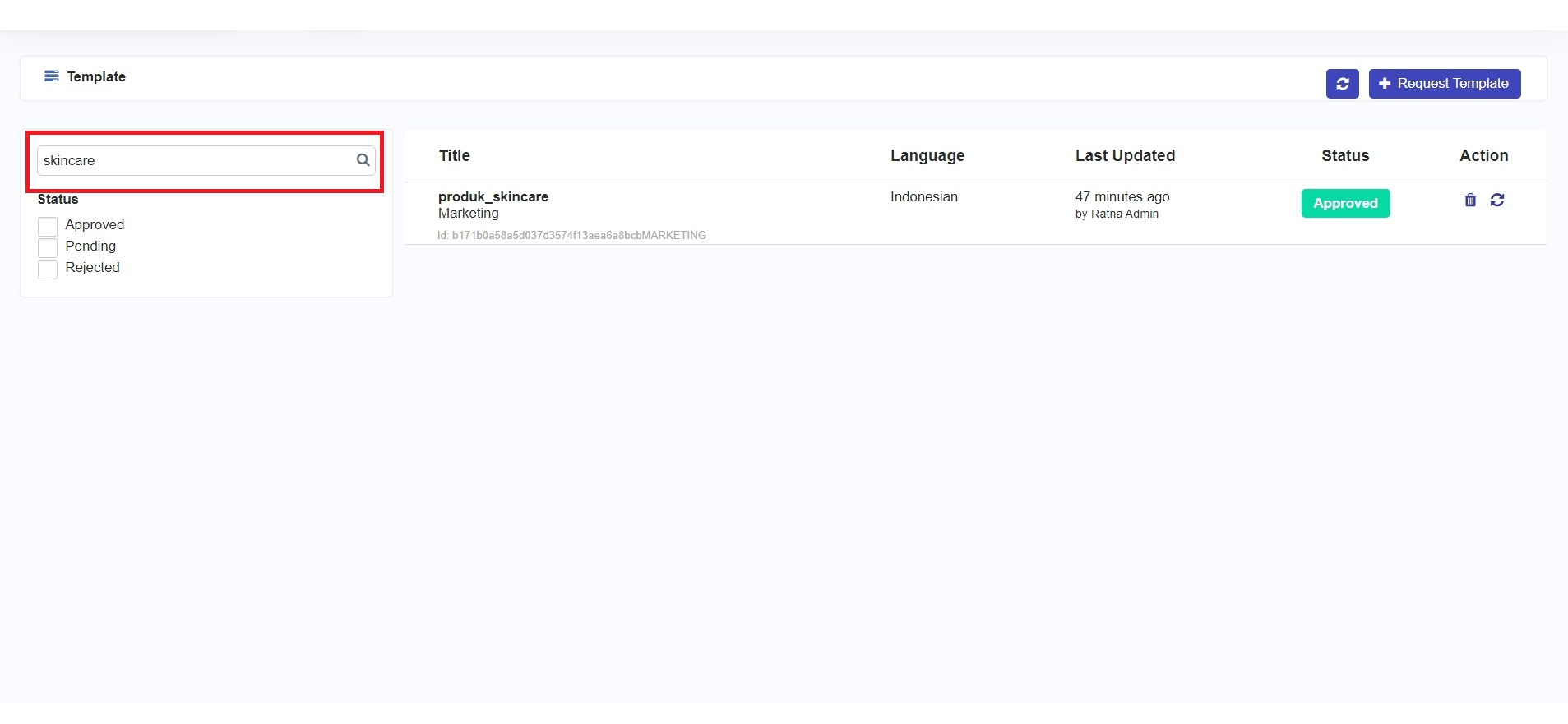 Jika Anda ingin mencari Template berdasarkan judul atau isi pesan, ketikkan kata kunci pada kolom pencarian kemudian klik tombol ikon **'Search'** maka pada halaman Template hanya akan menampilkan daftar Template yang sesuai dengan kata kunci seperti pada gambar berikut.