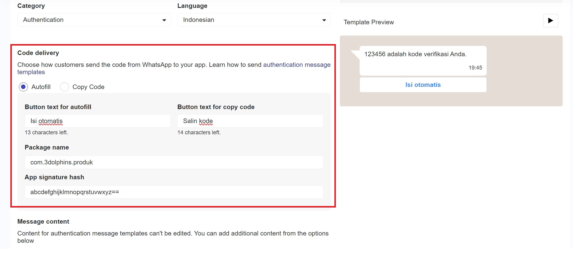 Button Text pada opsi Copy Code digunakan untuk menentukan teks yang akan ditampilkan pada tombol di pesan WhatsApp Authentication. Ketika pengguna menerima pesan berisi kode verifikasi, tombol dengan teks ini memungkinkan pengguna menyalin kode verifikasi secara otomatis ke clipboard hanya dengan satu klik, sehingga memudahkan dan mempercepat proses input kode ke aplikasi.
