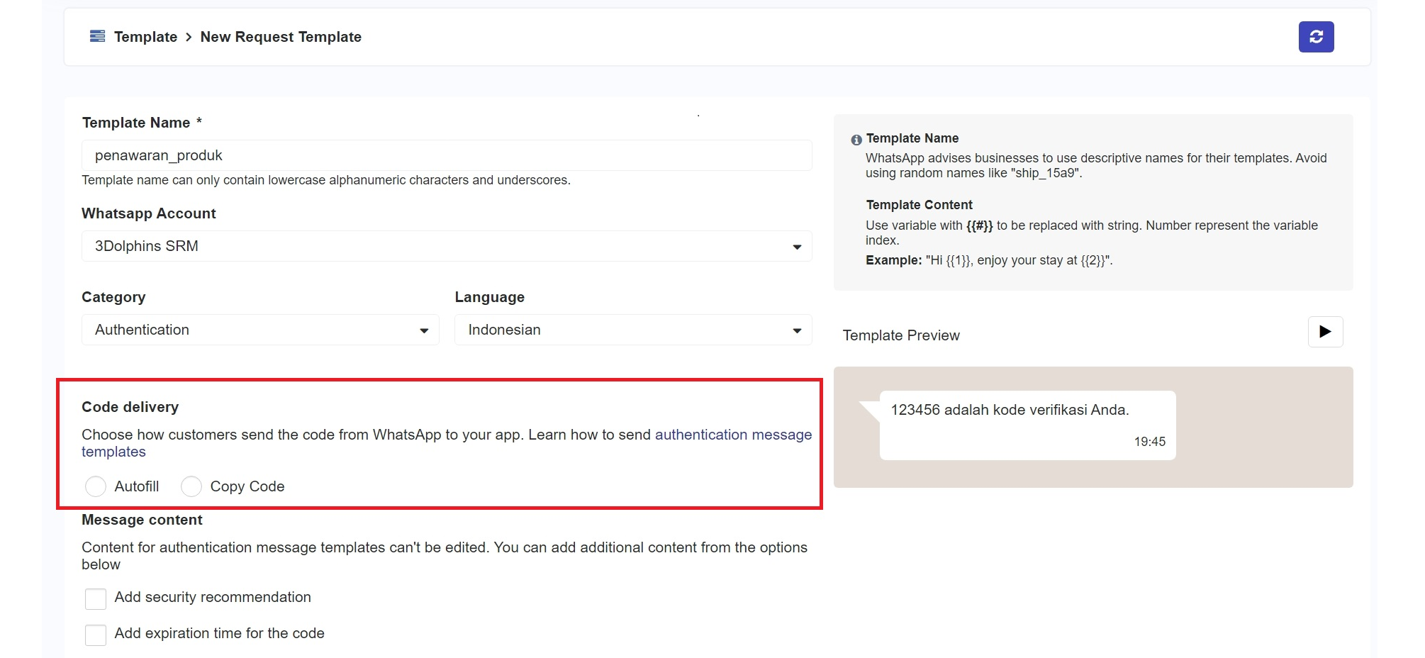 Untuk memudahkan pelanggan, Anda dapat menggunakan fitur untuk pengiriman verifikasi yang dapat Anda pilih dalam template Authentication. Dengan fitur ini, memudahkan Anda untuk meningkatkan keamanan serta kenyamanan pelanggan dalam proses verifikasi.