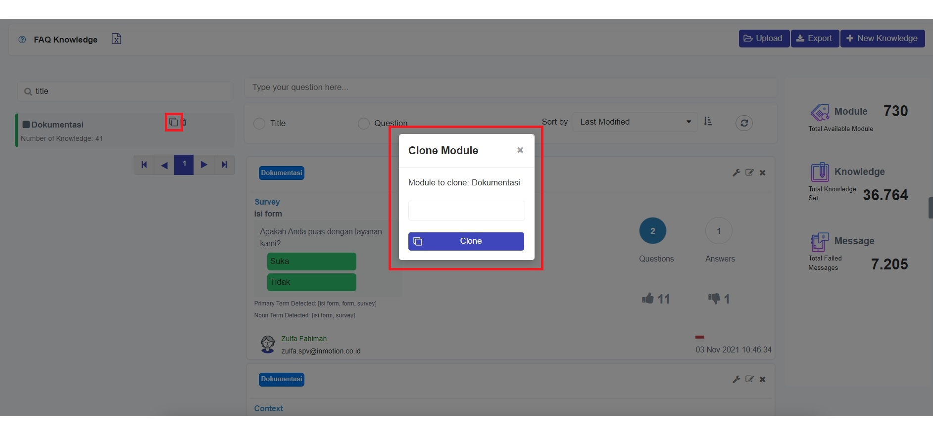 This feature will duplicate the previously created module. For example, if you have previously created the "Dokumentasi" Module and you have a new need to create a knowledge module from a different Bot, then you can try duplicating the Module by selecting the **'Clone'** button (<img src="https://765826444-files.gitbook.io/~/files/v0/b/gitbook-legacy-files/o/assets%2F-MNQidQwa-0K9_KnQpoc%2F-MXkH81owZ1WLUZzuqAC%2F-MXkI0CAs5vkz-tuEkWq%2Ficon%202.png?alt=media&#x26;token=2ebd4889-276a-4c27-a848-9e8a0da10c7b" alt="" data-size="line">) on the right of the Module name.