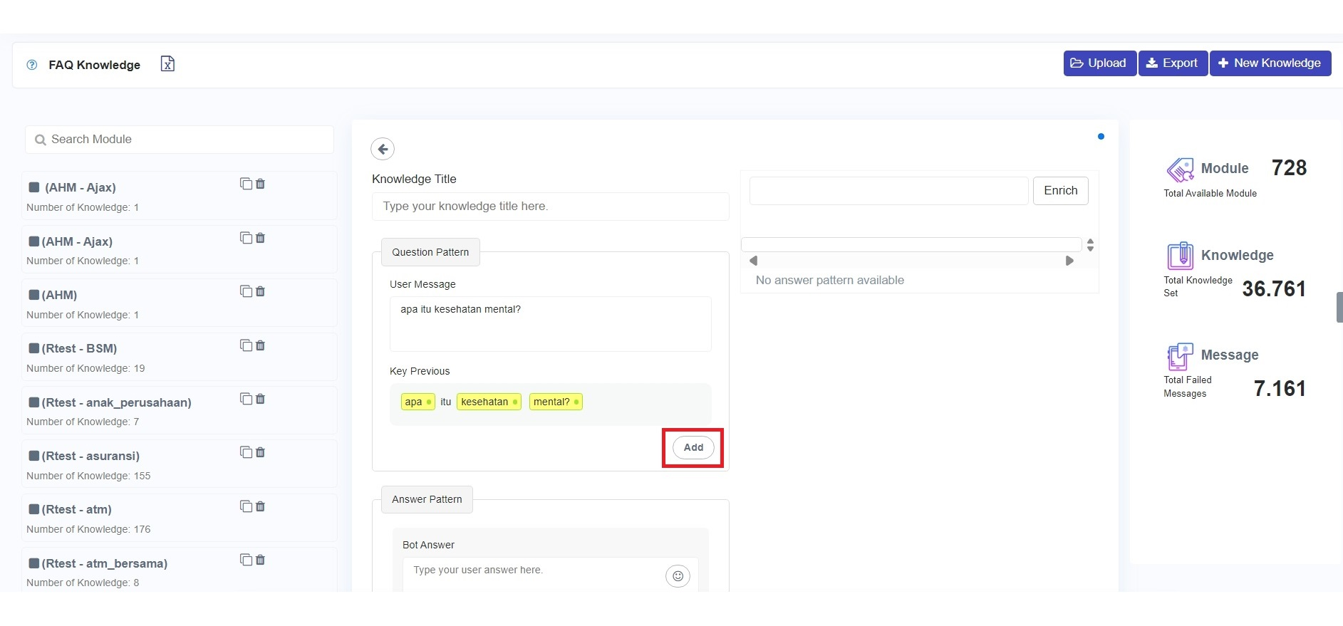 Enter the title and question from your knowledge. Then, the system will automatically map the words into **Key Previous**. In Key Previous, you can highlight the words that the Chat Bot should accurately respond to. Click the **'Add'** button to add a question pattern.