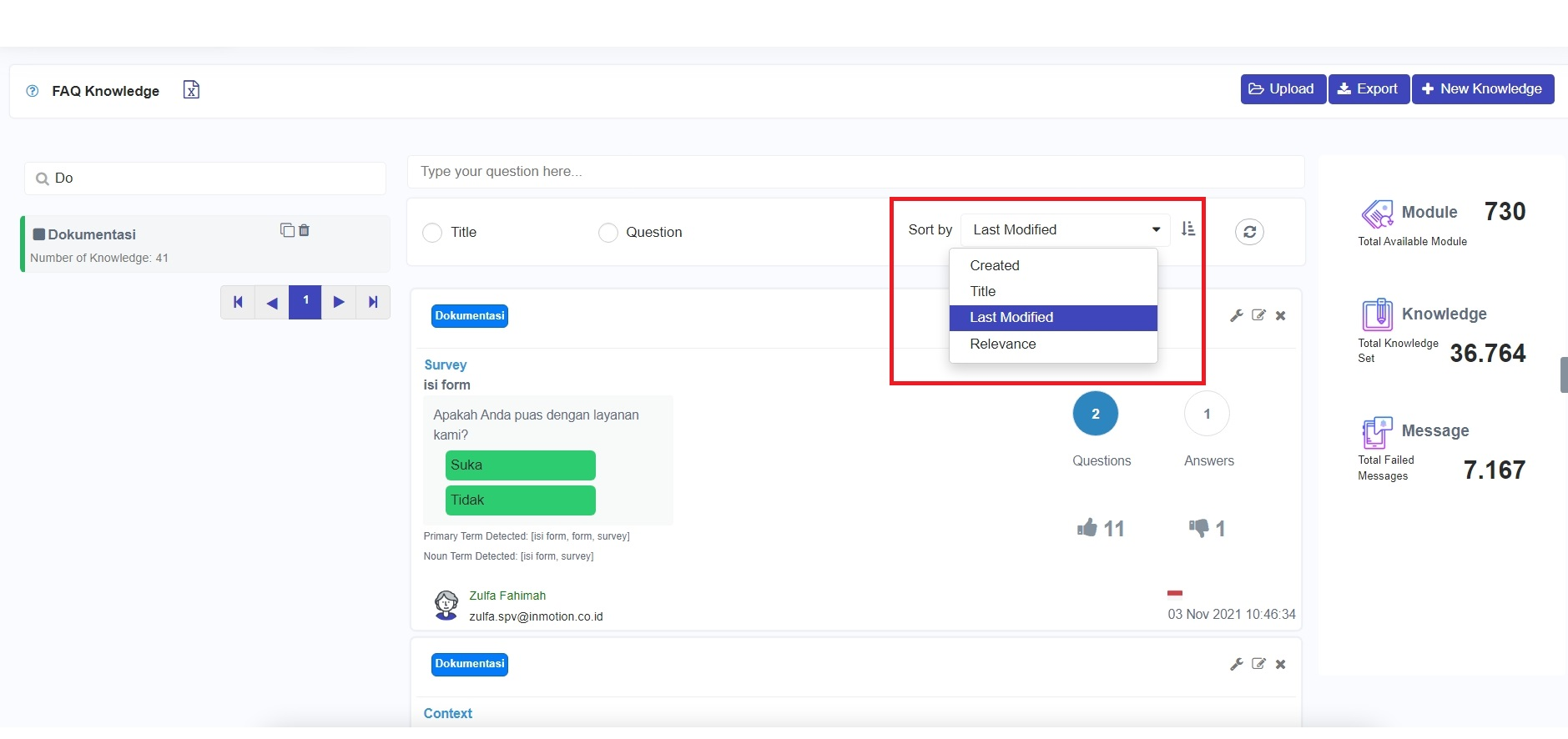 | Last Modified | Knowledge is sorted by the last modification date.    |