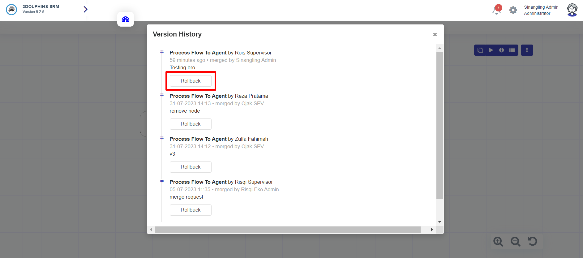 A pop-up from version history will appear. This pop-up will display all approved changes. Click the 'Rollback' button to roll back the workflow before the changes were applied, as shown below.