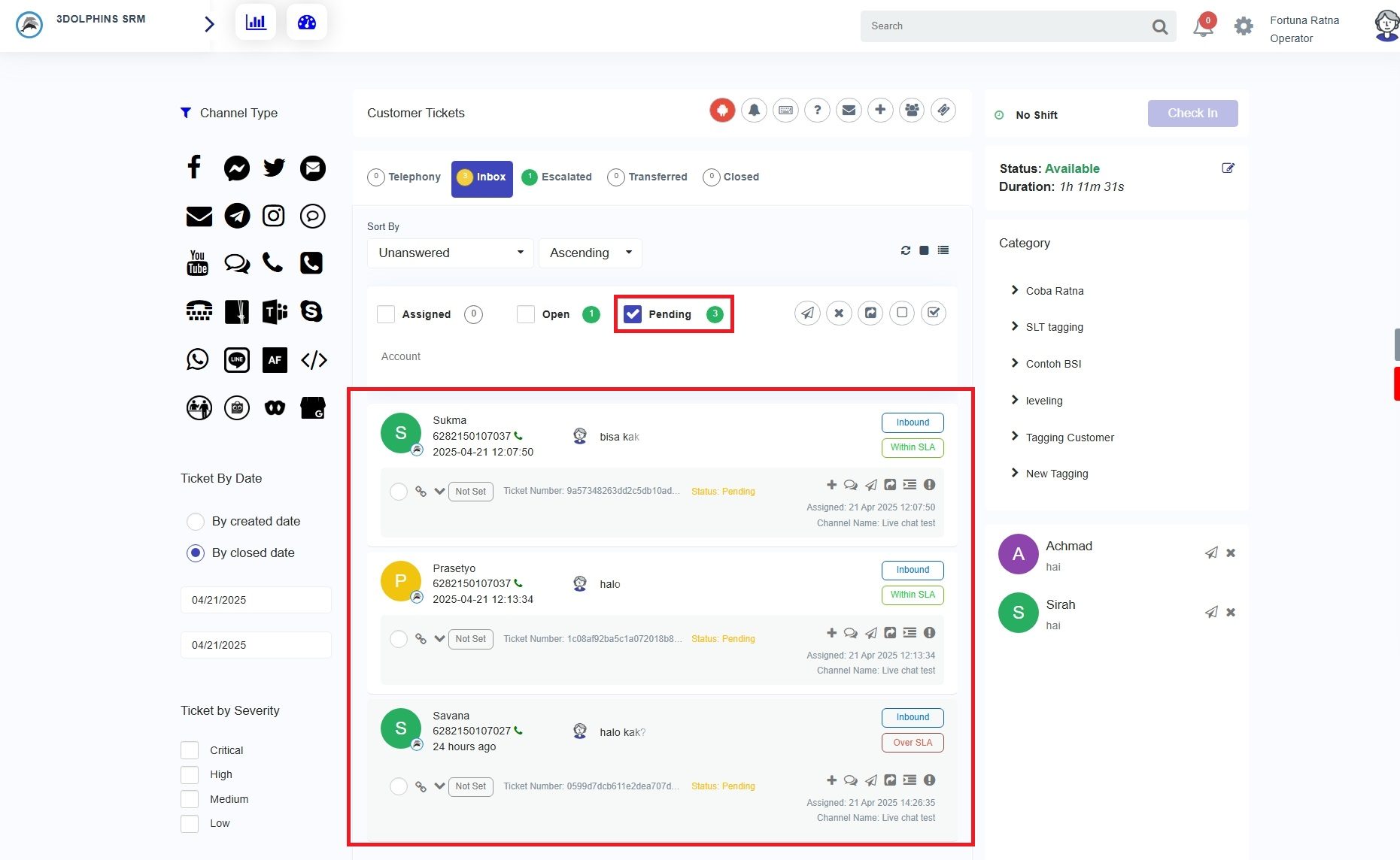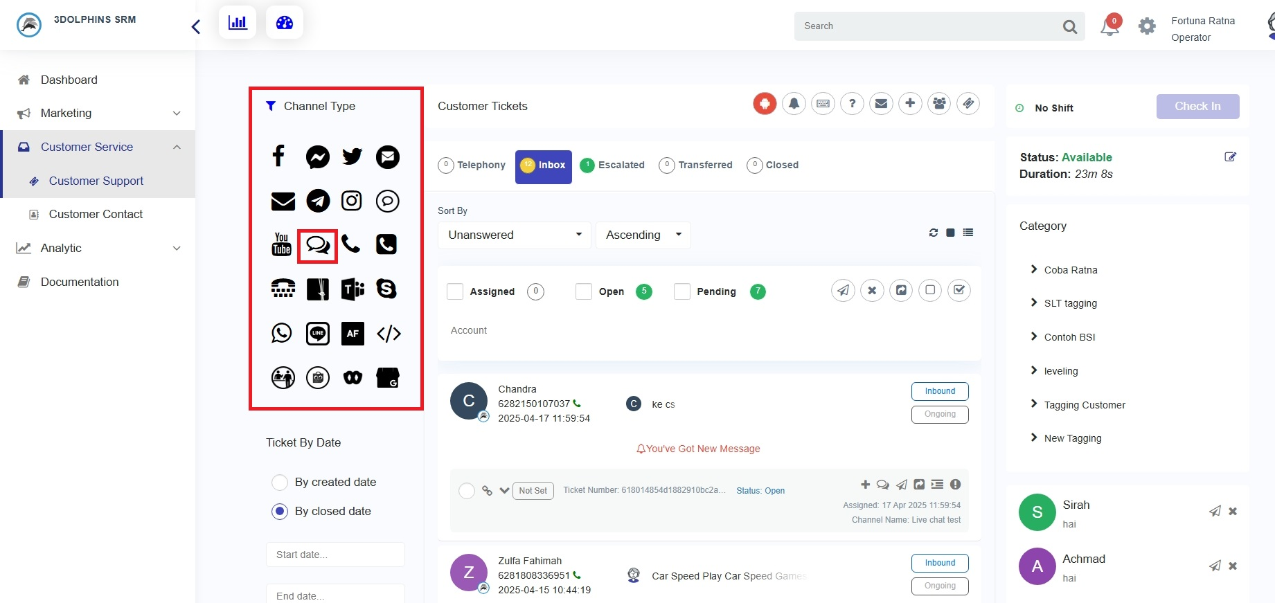 To get started, log in as an **Operator**, then select the **Customer Service** menu and click on the **Customer Support** submenu. After that, choose a channel from the **Channel Type** box. For example, if you select the channel type **'Dolphin Live Chat',** you will see tickets with the **'Live Chat'** type, as shown in the image below.