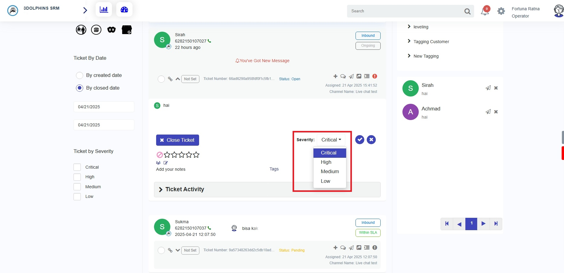 First, before you can filter tickets based on their severity level, you need to set the severity level for each ticket. To do this, go to the **Customer Service** menu and click on the **Customer Support** submenu. Then, select a ticket and click the icon (![](https://765826444-files.gitbook.io/~/files/v0/b/gitbook-x-prod.appspot.com/o/spaces%2FLYDAnLjpg2T8z2BplJOS%2Fuploads%2Fsql4ONtaNJtMcKPVqZma%2Fimage.png?alt=media\&token=527dc874-0ccf-4a0c-8c05-8f49ad17176c)). After that, change the severity level by selecting the appropriate severity level and clicking the **'Save'** button (![](https://765826444-files.gitbook.io/~/files/v0/b/gitbook-x-prod.appspot.com/o/spaces%2FLYDAnLjpg2T8z2BplJOS%2Fuploads%2FN30RxDujsTFv8IZsOyot%2Fimage.png?alt=media\&token=995b5458-3eeb-4fae-82d1-817dd99fbe7f)).