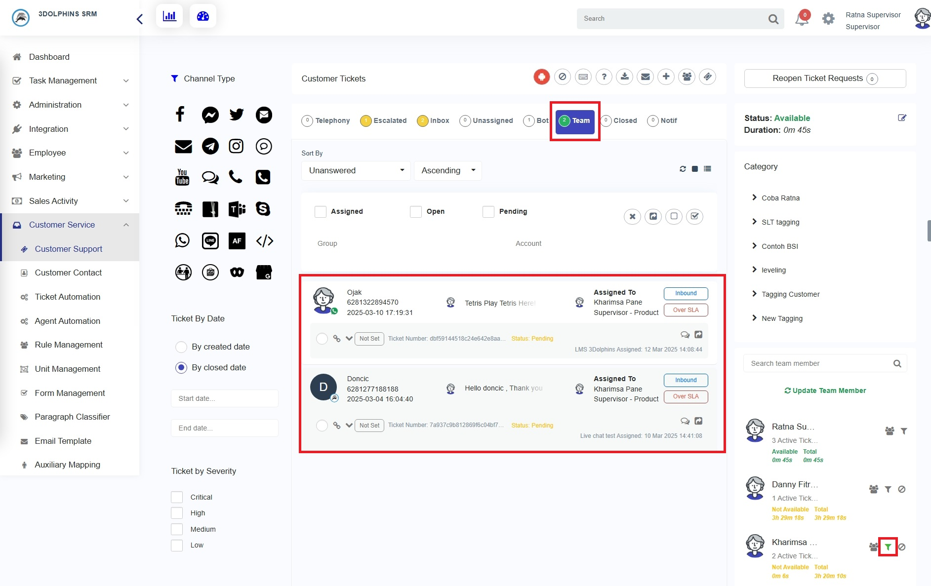 First, log in as a **Supervisor**, then go to the **Customer Service** menu and navigate to the **Customer Support** submenu. After that, open the **Team** tab. From the list of active team members, select a team member and click the **'Filter'** button (![](https://765826444-files.gitbook.io/~/files/v0/b/gitbook-x-prod.appspot.com/o/spaces%2FLYDAnLjpg2T8z2BplJOS%2Fuploads%2FDlQtexpn8bu1QhOjuxAx%2Fimage.png?alt=media\&token=5cc2cc0a-6b84-475a-a4fa-d6ab54d53f3e)). Then, you will see all tickets assigned to the selected team member.