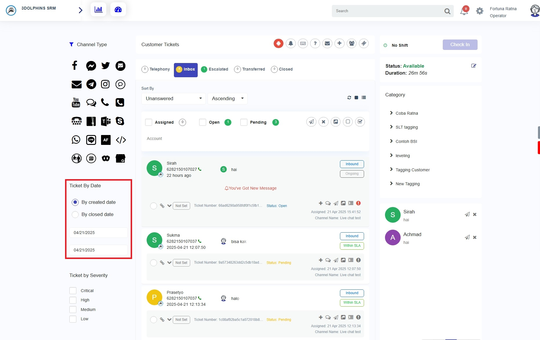 The Tickets tab allows you to filter data based on various parameters. For example, if there are so many tickets assigned to the Agent and the Agent want to view the ticket with a certain parameter only, the Agent can use this feature to filtering ticket by its parameter. Inside the Dashboard, you can see the right sidebar display the options to filter your tickets. In the 3Dolphins system, filter tickets consist of 6 (Six) categories, i.e: