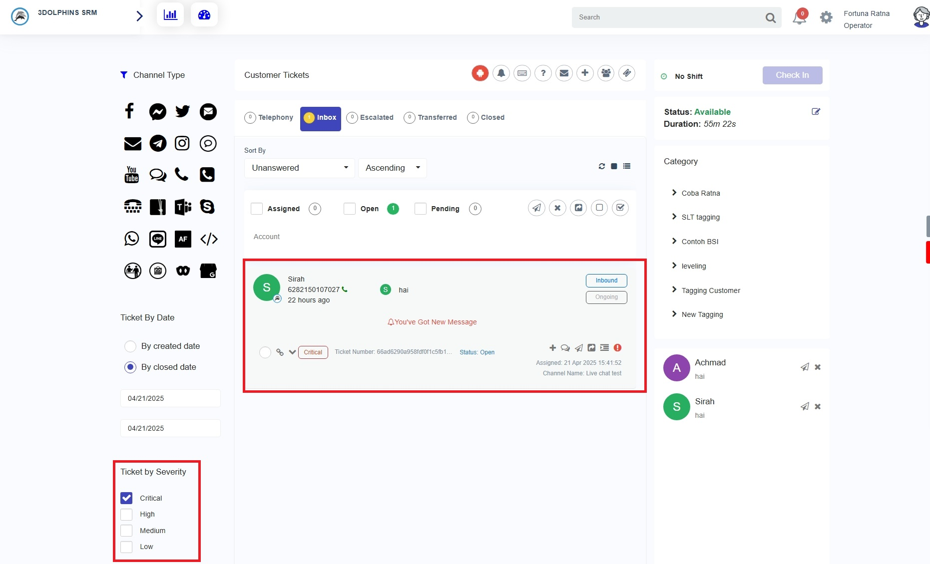 Allows the Agent to filter tickets based on channel type. By using this ticket filter you can see particularly (separate / distinguish) the type of tickets you received. For now, 3Dolphins can filter 20 channels type, i.e.: