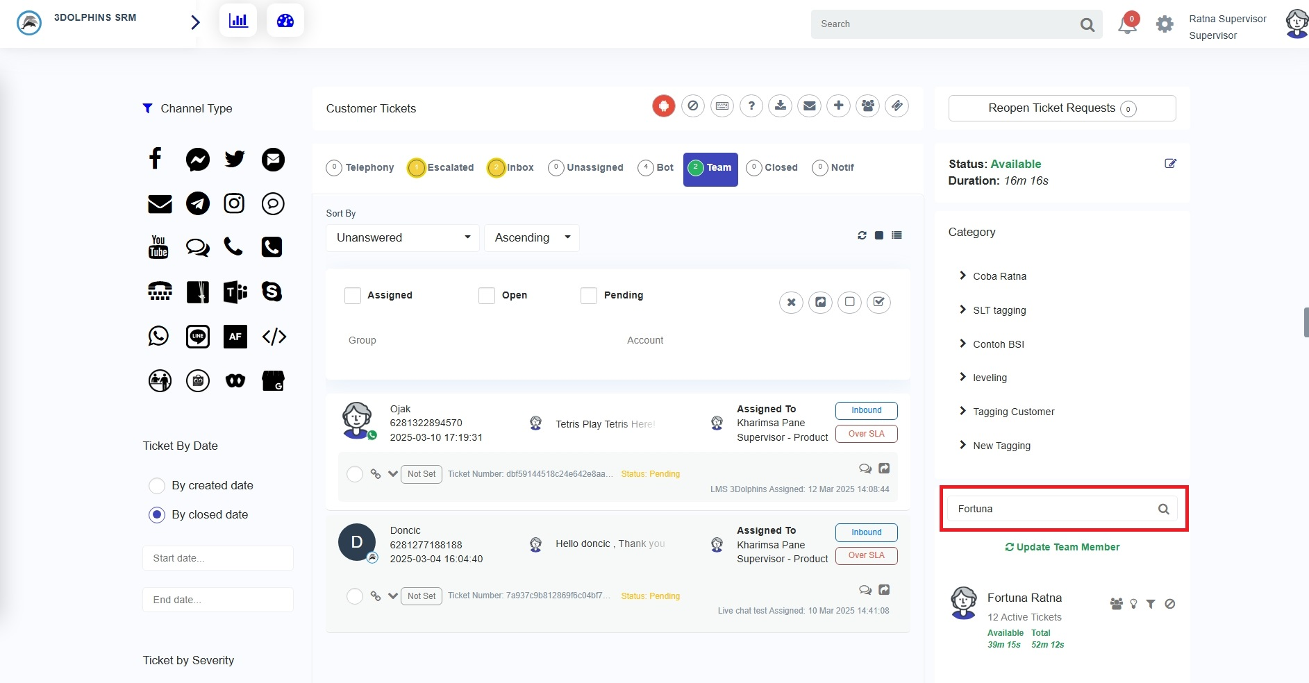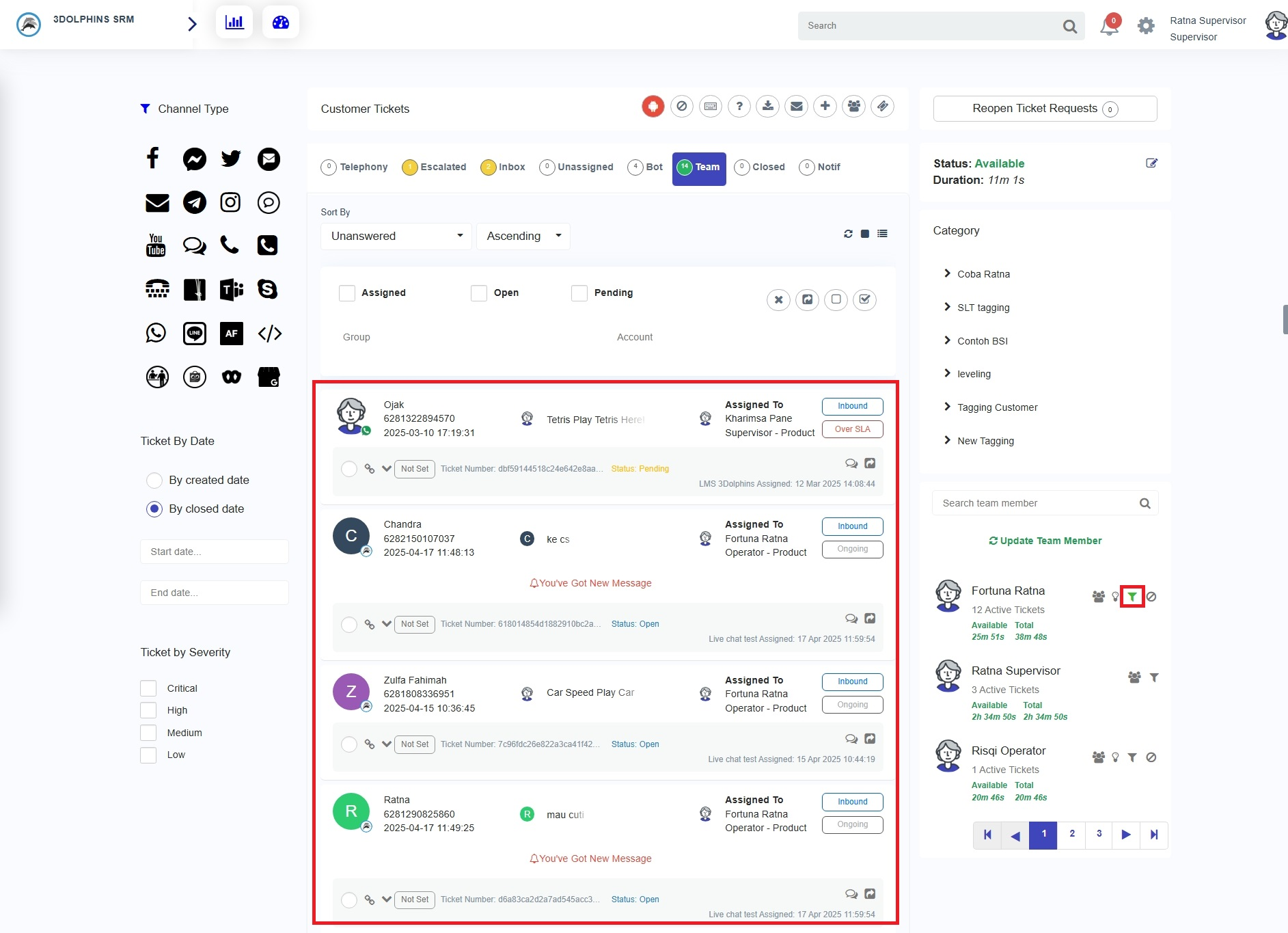 To begin, you can go to the customer support page. On the list of active team members, select team members, and click the 'Filter' button ( ). If successful, you will see the button becomes green, and all tickets that are being handled by the team members that you are selected.