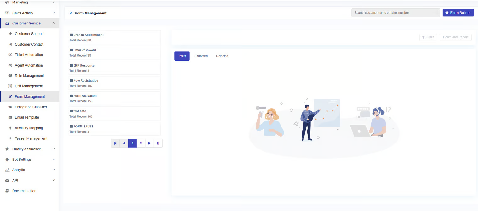 Sometimes, you need to collect additional information from your customers, such as when they want to register for your application. To do this, you can use a form. Before sending the form to customers, you need to create it first on the form management page. This page also allows you to manage, review, and process the forms you’ve created. The form management menu consists of two sections: **Form Record** and **Form Builder**.