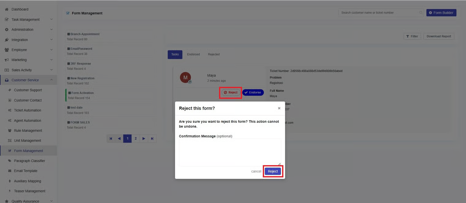 When a customer fills out a form sent by a user, the form is automatically saved by default under **Customer Service > Form Management > Form Record > Tasks**, which you can view on the right side to get approval or rejection from the Agent. These forms are also categorized by module, making it easier for you to view all forms based on a specific module.