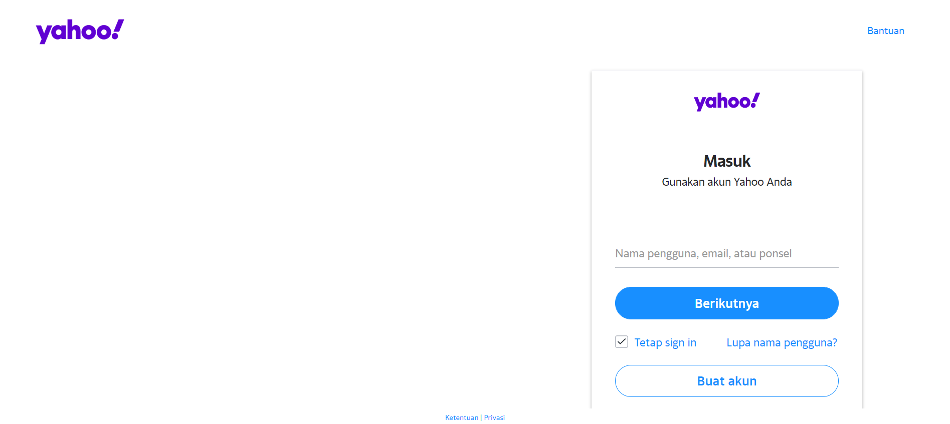 Enter your yahoo account email address, username, or phone number. Then, click the **'Berikutnya'** button.