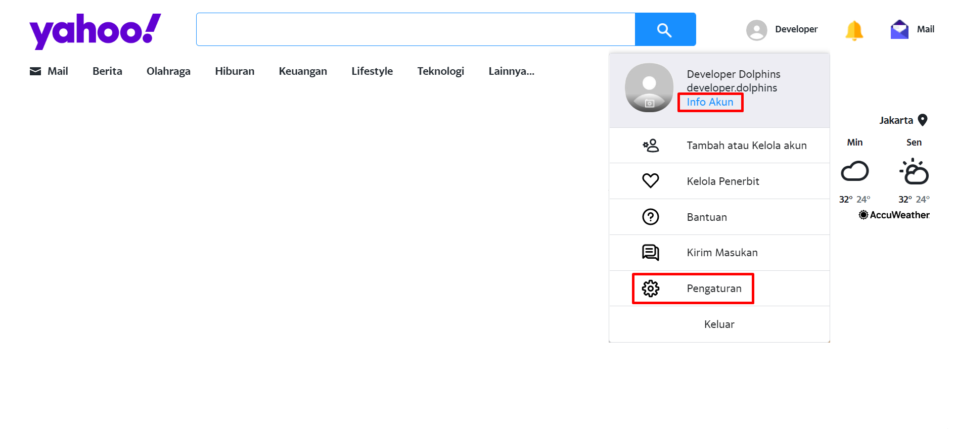Then, you are redirected back to the main Yahoo page. Click the **'Info Akun'** or **'Pengaturan'** button on your profile icon to enter the Yahoo settings page.