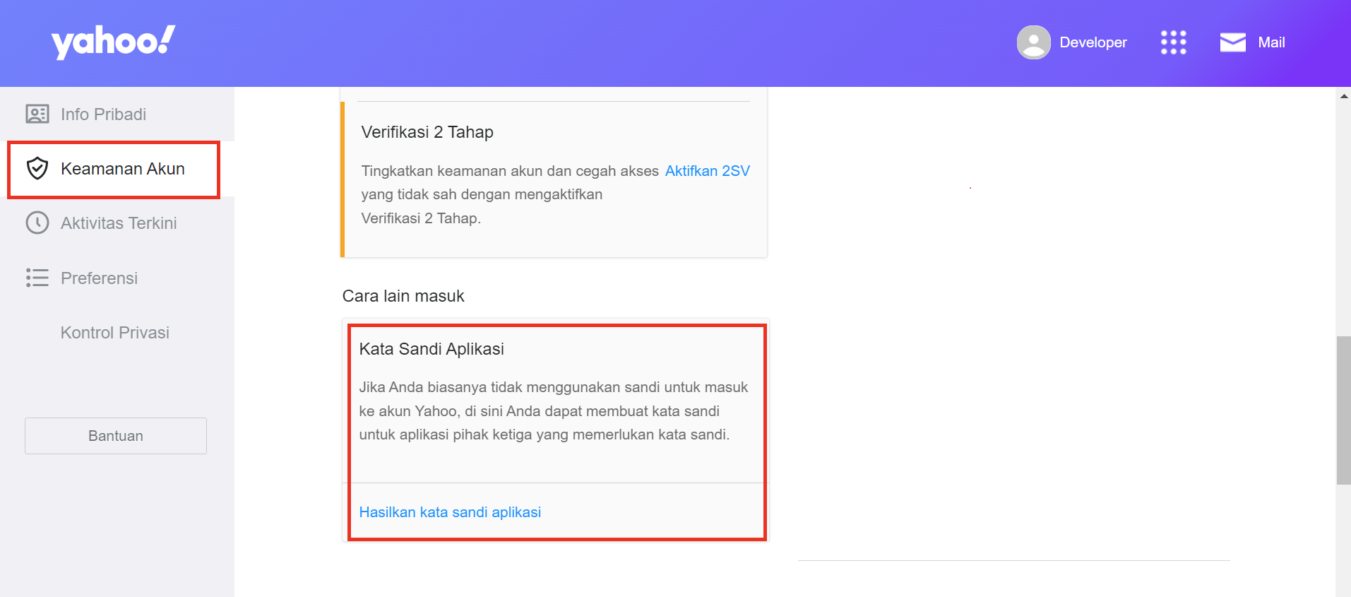 You will see the settings page and click the **Pengaturan Akun** menu. Then scroll down to the **Kata Sandi Aplikasi** section and click on the **'Hasilkan kata sandi aplikasi'** button.