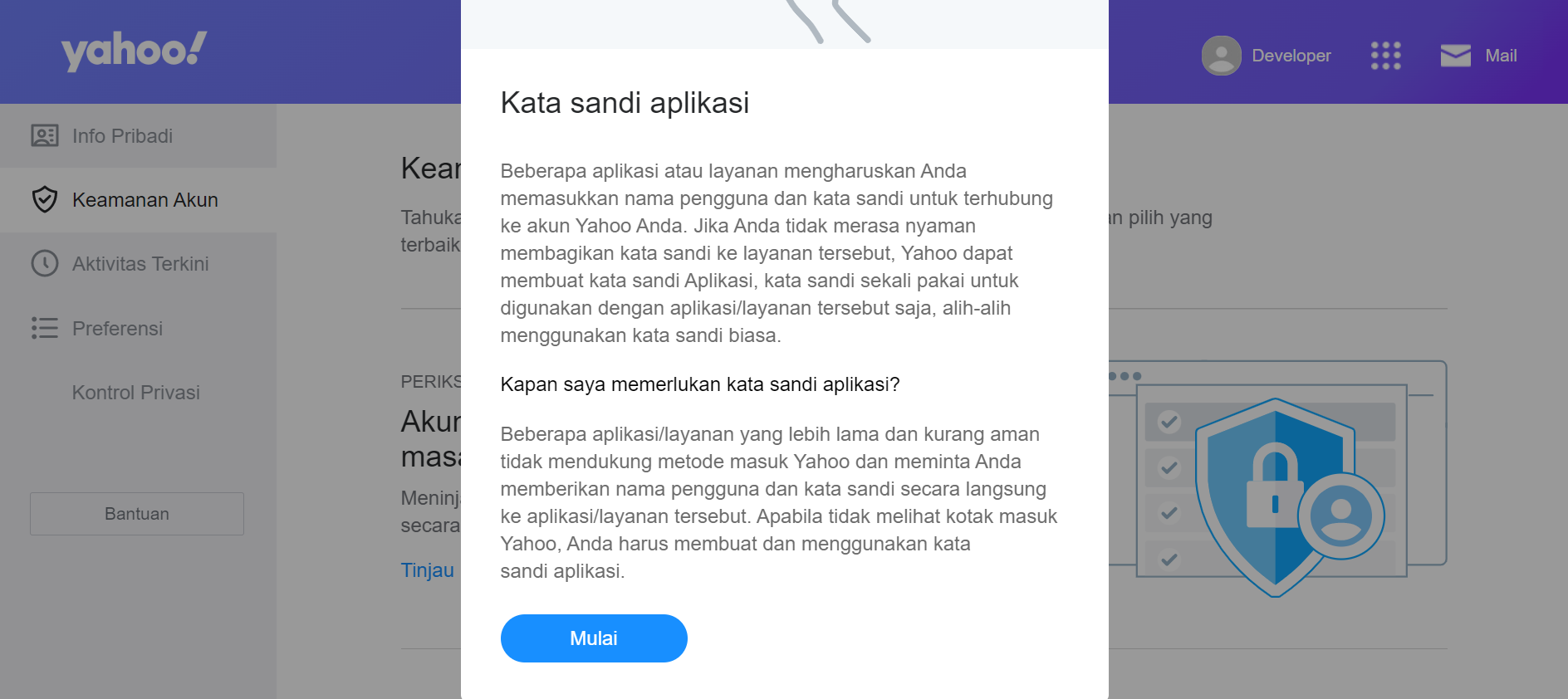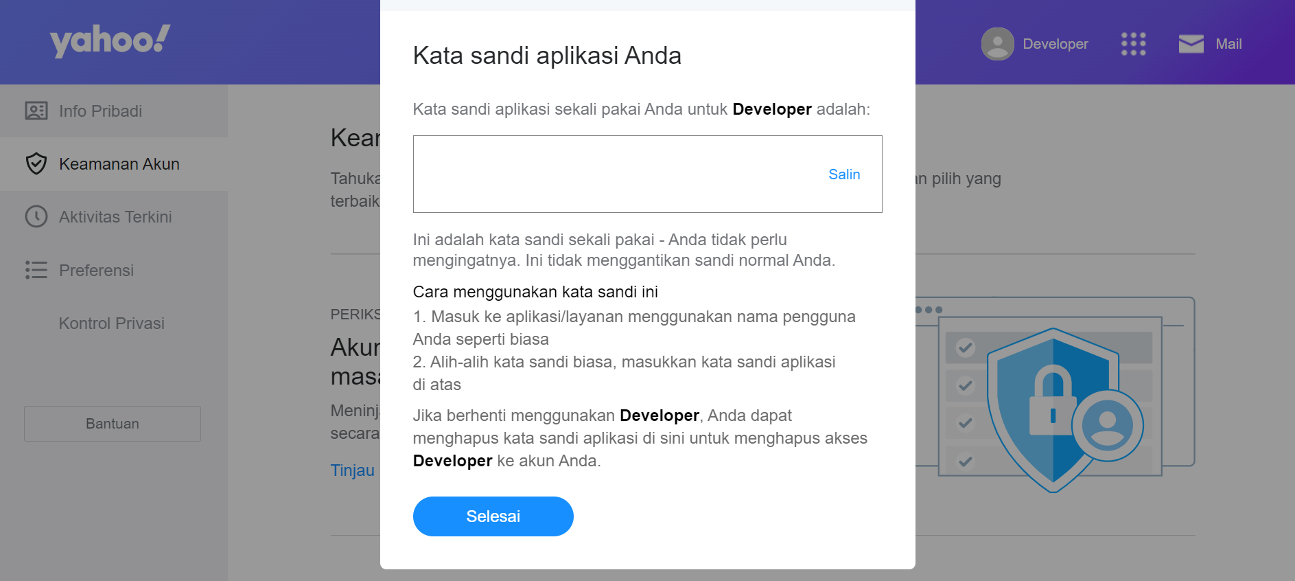 You could save the app password that Yahoo has provided upon viewing it. Then, click the **'Selesai'** button.