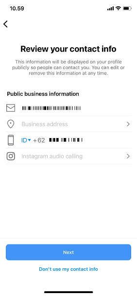 Instagram will confirm your business account type according to the category you have previously selected. Click **'Next'**.