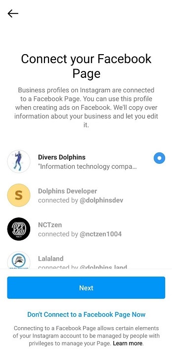 Connect your business Instagram account with your company's Facebook page. Click **'Next'**.