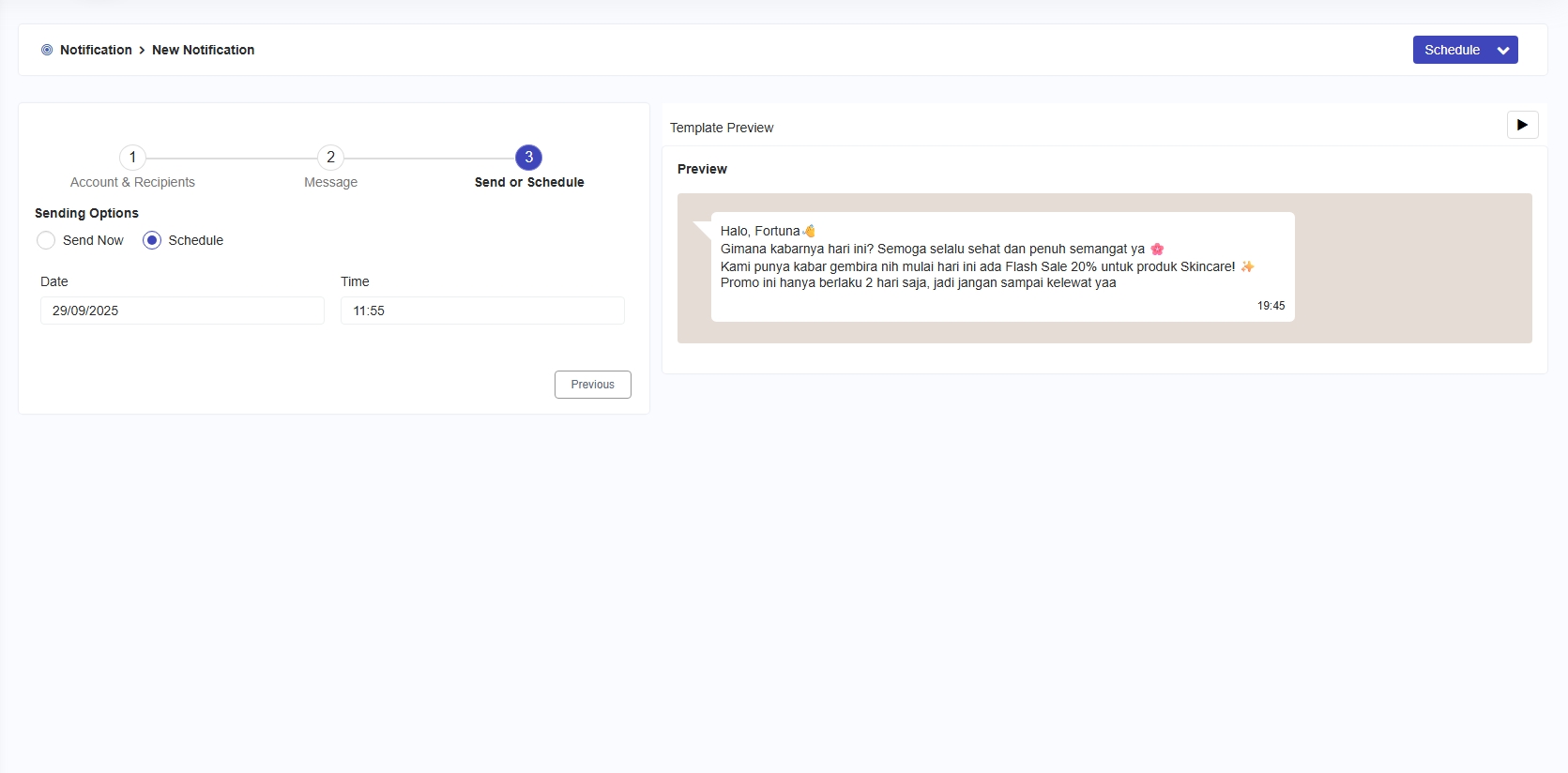 Then, click the **'Schedule'** button at the top right corner of the page, and the notification will be created immediately and displayed as shown in the image below.