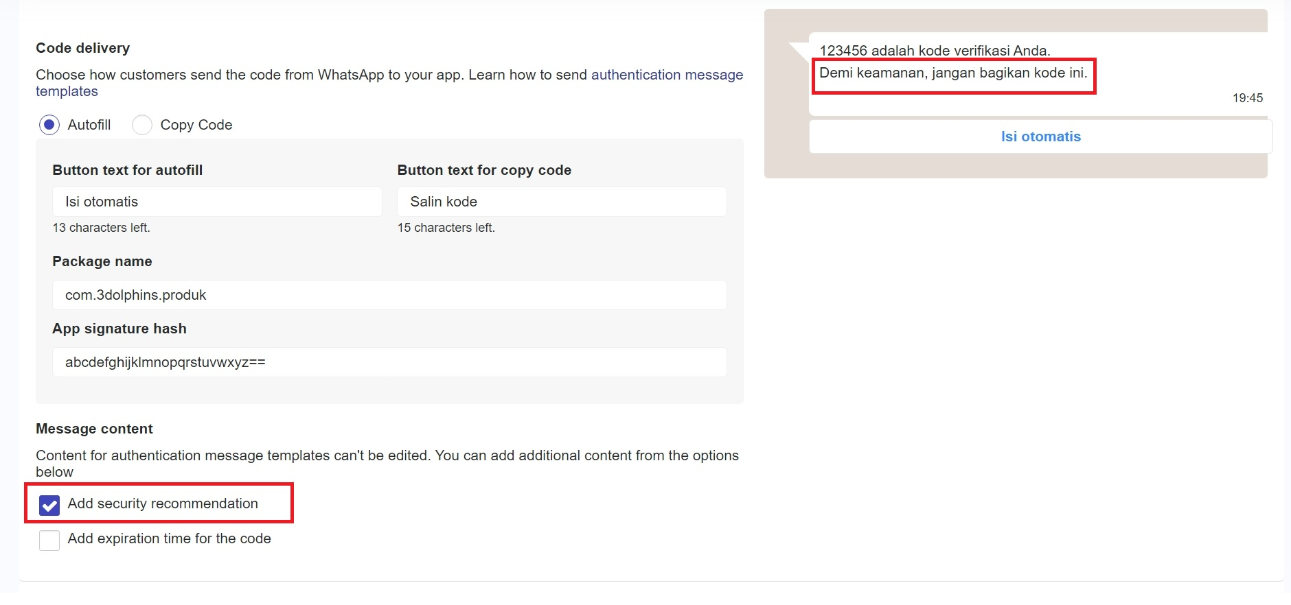 **Message Content** is used to send a verification code (OTP) to customers. The message content is predefined by WhatsApp (default) and cannot be edited. However, you can choose options to enhance security and make the message clearer as follows:
